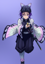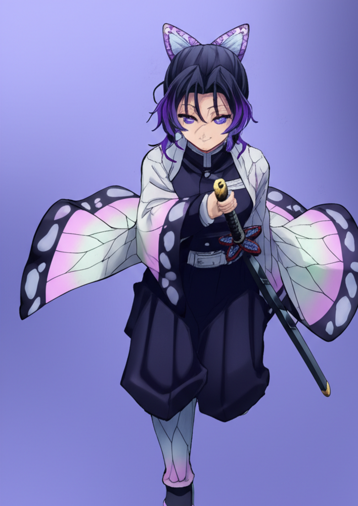 Shinobu Kocho, the graceful Insect Hashira from Demon Slayer, is beautifully depicted surrounded by delicate butterflies and purple wisteria flowers in this stunning scene. This artwork captures her serene yet fierce spirit, perfect for any anime fan.